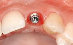 In September 2004, a 38-year-old female patient, a nonsmoker, was referred to our clinic for the replacement of the missing left central maxillary incisor (tooth 21),which had been removed two months before the initial appointment due to a vertical root fracture. The dental patient history revealed that the tooth in question had supported a ceramo-metal crown for more than ten years before the root fracture occurred. Implant therapy (single-tooth replacement) was considered the first therapeutic choice, as the neighboring teeth did not require significant restoration. The patient was in good general health, and her medical history revealed no significant findings.