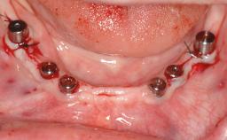 A 46-year-old woman was referred for treatment whose main complaints were mobility of her fixed partial dentures (right maxilla and left mandible) and periodontal bleeding during function. She also reported having taken systemic antibiotics to treat recurrent swelling in the area of the upper left molars. The patient had not seen a dentist for at least 2 years. She did not smoke and had no history of major systemic disease other than two minor orthopedic procedures some years back. The first-visit examination revealed poor plaque control, tooth mobility, periodontal disease, and a residual dentition widely associated with deep periodontal pockets.