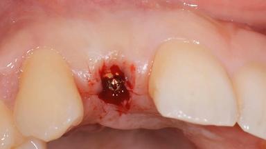 After flapless tooth removal and a healing period of 6 weeks a diameter-reduced two-piece implant is placed. The bone defect on the facial aspect is corrected with a contour augmentation using autologous bone chips covered with DBBM particles and a collagen membrane according to the Guided Bone Regeneration (GBR) approach.