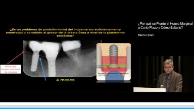 El objetivo de esta conferencia es revisar las posibles causas de la pérdida ósea marginal temprana alrededor de los implantes. Se sugiere una definición para este fenómeno y su posible correlación con el comienzo de la periimplantitis. El Dr. Orsini, presenta abundante material gráfico con ejemplos de pérdida ósea marginal temprana a fin de enumerar las distintas situaciones clínicas asociadas a este suceso. Finalmente se procede a proporcionar una serie de recomendaciones clínicas y biológicas para reducir la pérdida ósea marginal temprana, apoyadas en una amplia revisión de la literatura disponible.