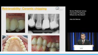 This presentation explains the advantages and disadvantages of cemented versus screw-retained prostheses. The lecture concentrates on three aspects: the retrievability of the prostheses and the biological issues associated with excess cement; the retention and resistance of crowns and fixed dental prostheses regarding the abutment height, degree of taper, surface area, and roughness; and finally the esthetics of cemented versus screw-retained superstructures. His conclusion is that both types of fixation influence the clinical outcome, with cemented prostheses having more biological complications and screw-retained prostheses having more technical problems.