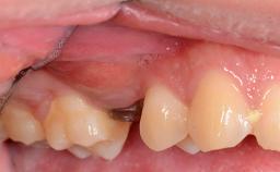Assessment, treatment, and remarks on a Type 1 immediate implant replacement of an upper left central incisor with a vertical root fracture. A healthy, 21-year-old male patient presented with traumatic fracture of his upper left central incisor. The patient's gingival phenotype was classified as medium. The clinical image demonstrates the characteristics of a medium phenotype with long, thin dental papillae combined with thick attached gingival tissues. The tooth had both a vertical root fracture and a horizontal fracture of the crown, resulting in exposure of the pulp and loss of root integrity.