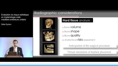 La présentation s’attache à détailler en quoi l’implantation en zone esthétique constitue un challenge lorsqu’il s’agit de réhabiliter la fonction sans oublier de rétablir l’esthétique. A travers quelques cas cliniques, le Dr Eycken s’appuie sur la classification SAC de l’ITI pour évaluer la complexité du cas et y apporter la solution thérapeutique adaptée. Il revient également sur l’importance du positionnement de l’implant dans les 3 sens de l’espace et sur la qualité des tissus mous environnants.