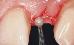 After flapless tooth removal and a healing period of 6 weeks a diameter-reduced two-piece implant is placed. The bone defect on the facial aspect is corrected with a contour augmentation using autologous bone chips covered with DBBM particles and a collagen membrane according to the Guided Bone Regeneration (GBR) approach.