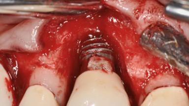 A 73-year-old woman was referred to the Division of Periodontology (University of Geneva School of Dental Medicine) after repeated unsuccessful treatment of a peri-implant infection. She was systemically healthy and did not smoke. The patient’s history revealed that, three years earlier, an immediate implant (Straumann Tapered Effect RN 4.8/4.1; Institut Straumann AG, Basel, Switzerland) had been inserted to replace the upper right central incisor. A metal-ceramic crown had been delivered using an adhesive resin cement. One year later, the patient had consulted another dentist due to discomfort in the soft tissues in the implant region. There was a suppurating peri-implant pocket, 10 mm deep. Peri-implant bone loss and excess luting cement were seen on the radiograph. The situation was treated with non-surgical debridement, amoxicillin, and repeated submucosal irrigation with a chlorhexidine digluconate solution. The patient was referred after the suppuration had persisted for several months.