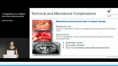 La prothèse implantaire amovible stabilisée par des implants prends plusieurs formes. La présentation explique les différents types d’attachements (barres et attachements axiaux). Les avantages et inconvénients sont présentés : surtout l’encombrement de tous ces dispositifs. Les complications sont exposées, l’importance d’une grille de renfort au sein de la prothèse est à prendre en compte. Le nombre d’implants et leur distribution sur l’arcade en fonction de la solution choisie sont passées en revue.