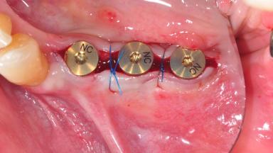 After the placement of three diameter-reduced two-piece implants the bone is augmented with autologous bone chips and DBBM particles to enlarge the crest volume. The surgery is completed with the application of two membrane layers and primary wound closure.