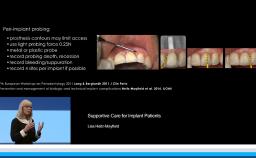 This presentation begins with a discussion of strategic extraction: whether teeth should be extracted as a first choice or kept as long as they function. An overview of estimated numbers of placed and failed implants internationally is given, and differences between the treatment strategies of prosthodontists, periodontists, general practitioners, and surgeons are presented. The definition, prevalence, and risk factors of peri-implantitis and related problems are emphasized. Assessment and diagnosis of peri-implantitis, the importance of radiographic assessment, and evaluation of progressive bone loss are described. The main part of the presentation concentrates on viable treatment options such as antibacterial therapy and ultrasonic debridement, highlighting that prevention is the best treatment.